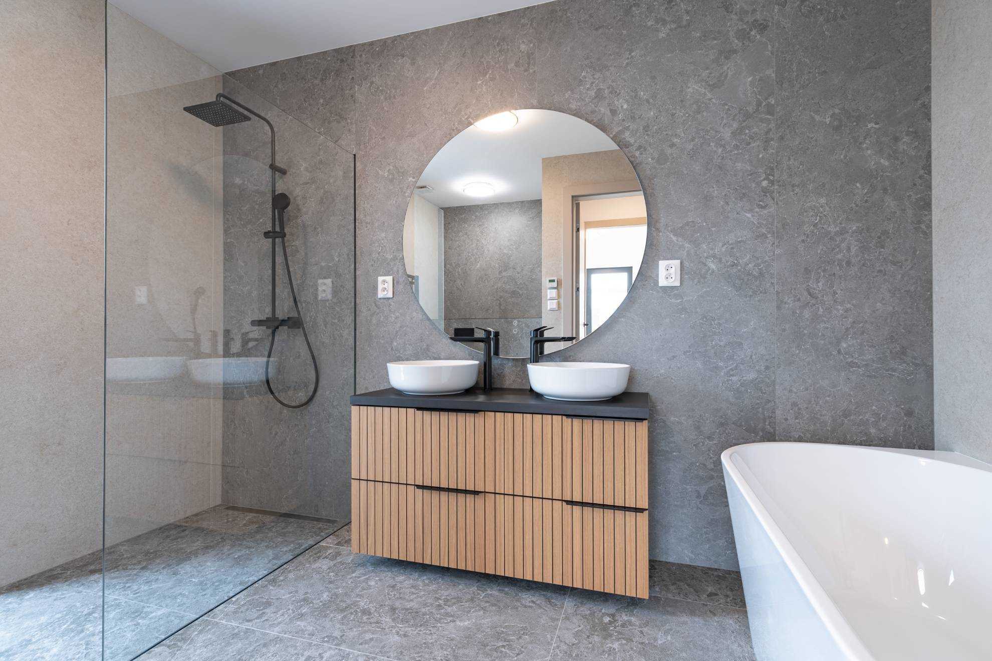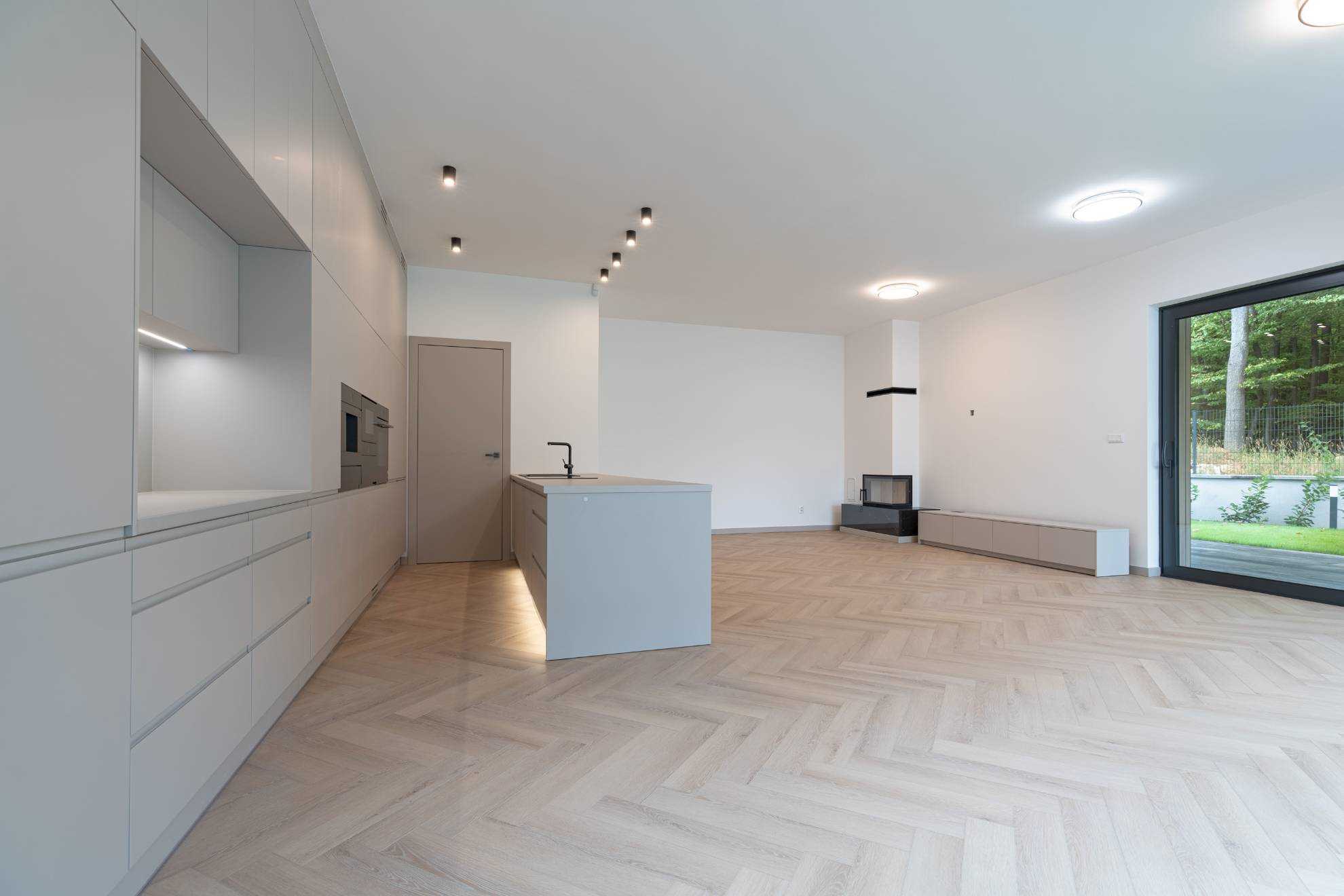 Dom sa predáva vo vysokom nadštandarde: kvalitné podlahy, kvalitné veľkoformátové HLINÍKOVÉ okná s exteriérovými elektrickými hliníkovými žalúziami, kvalitné interiérové dvere so zárubňami, 2 moderné kúpeľne s veľkoformátovými obkladmi a sanitou HANSGROHE, kuchynská linka so zabudovanými spotrebičmi BOSCH.
